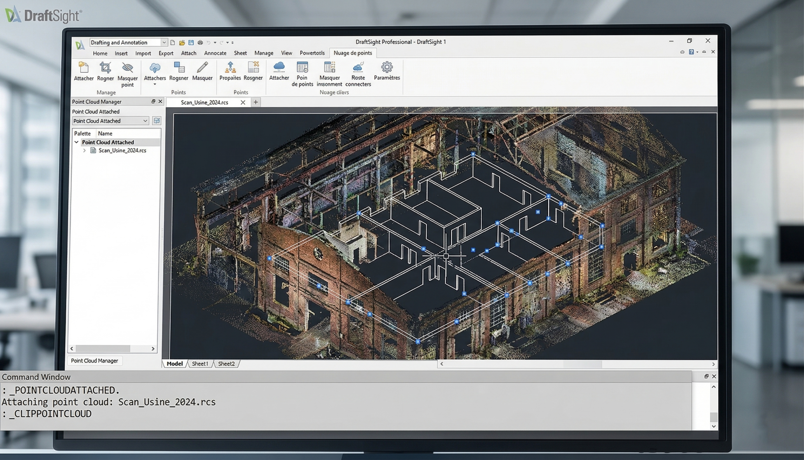 Aujourd’hui, les scanners laser 3D et les drones dominent le secteur du relevé topographique et architectural. Par conséquent, les géomètres et les dessinateurs récoltent des données tridimensionnelles massives. Ainsi, vous devez absolument intégrer ces données dans votre flux de travail CAO quotidien. Heureusement, vous pouvez utiliser les nuages de points DraftSight (disponibles dans les versions Professional et Premium) pour répondre à ce besoin. En effet, cette fonctionnalité connecte directement la réalité du terrain à votre espace de dessin.